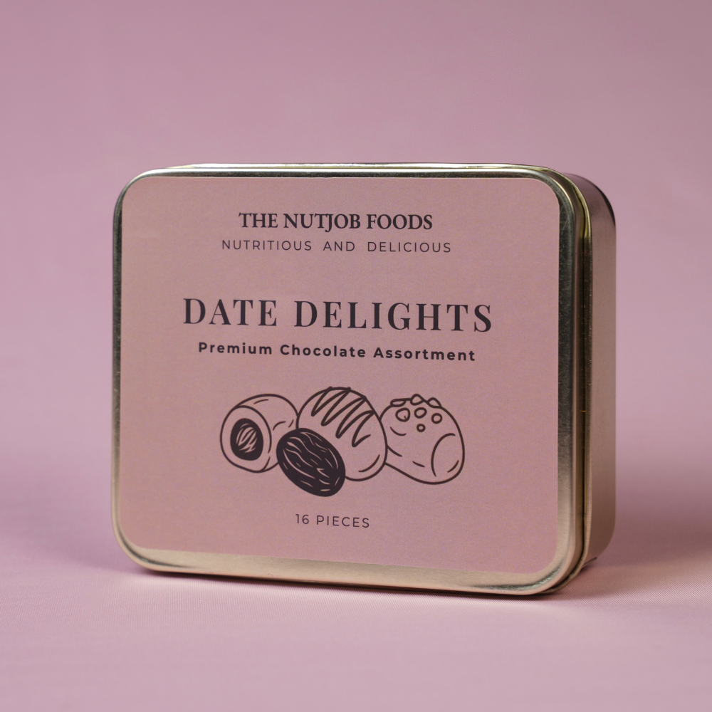 Finding a way to say 'Thank You' to someone who has been there for you? Our chocolate box is perfect for you! Indulge in pure chocolate bliss with The NutJob Foods Date Delights Premium Chocolate Assortment. This elegant 'Thank You' gift box features 16 exquisite pieces of date-based chocolates in four delectable varieties. Each selection includes 4 pieces of Double Almond Crunch, combining the rich sweetness of dates with crunchy almonds; 4 pieces of Dark Chocolate Coconut, offering a sophisticated blend of intense chocolate and tropical coconut; 4 pieces of White Chocolate Coconut, presenting a creamy, sweet alternative; and 4 pieces of Chunky Peanut Butter, delivering a satisfying nutty experience. Beautifully presented in a premium tin box adorned with delicate flower and butterfly motifs, this assortment makes for a perfect gesture of gratitude or a sophisticated treat for any special occasion. The harmonious combination of nutritious dates and premium chocolate creates an indulgent experience that's both delicious and memorable.