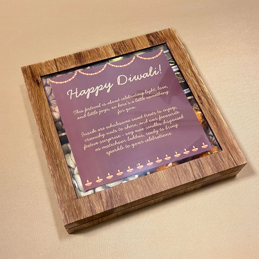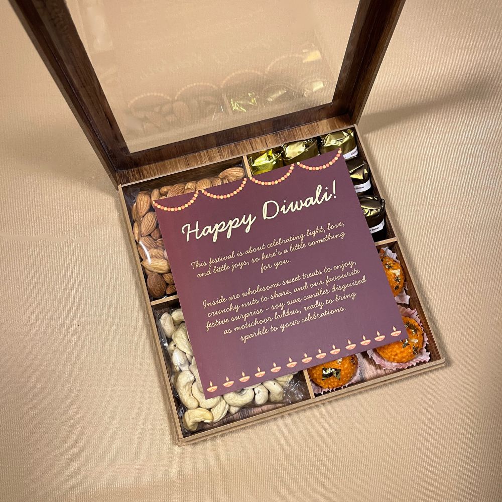 Premium Diwali Gift Box with Assorted Dates Chocolates, Almonds, Cashews, Soy Wax Motichoor Candles, Wooden Box, 500g